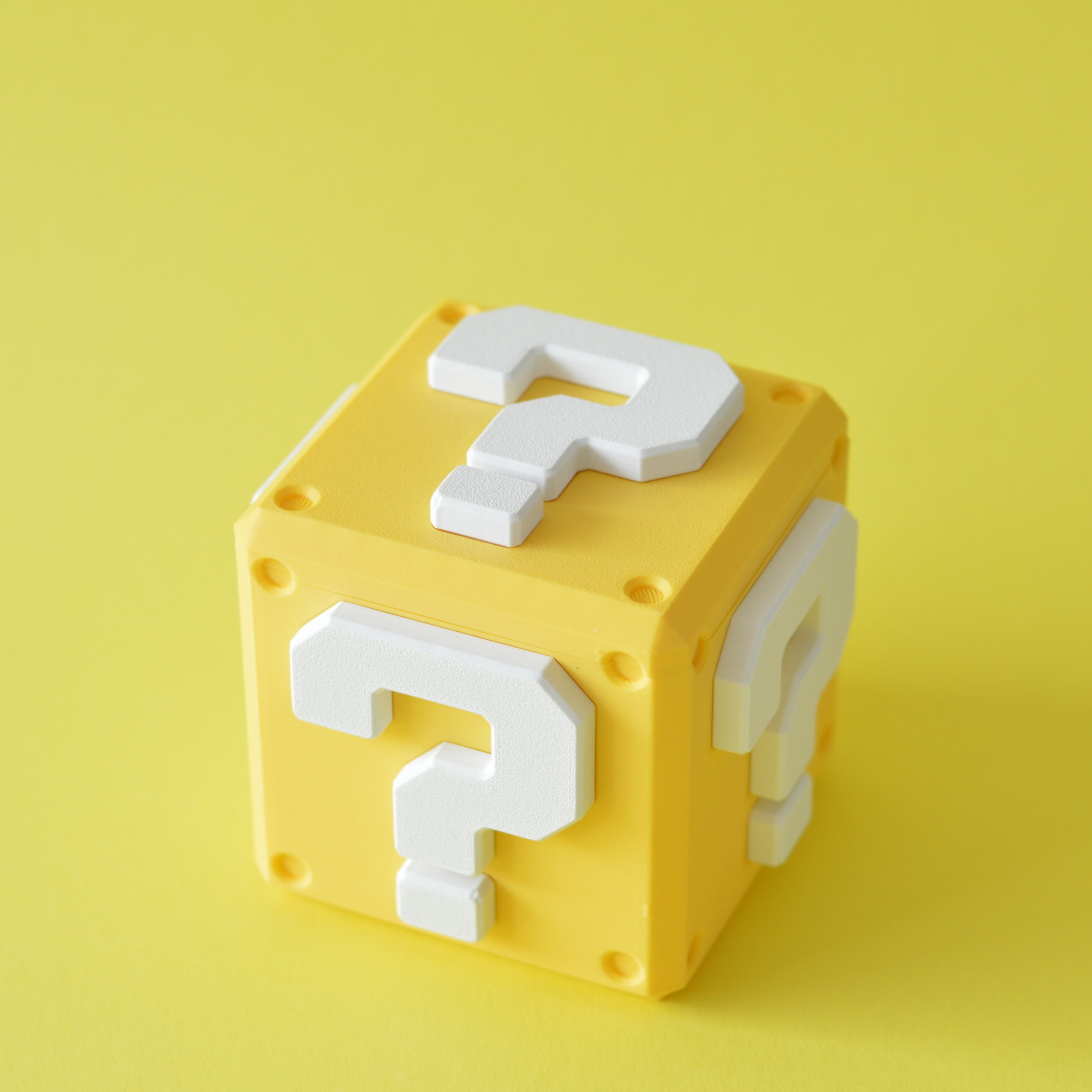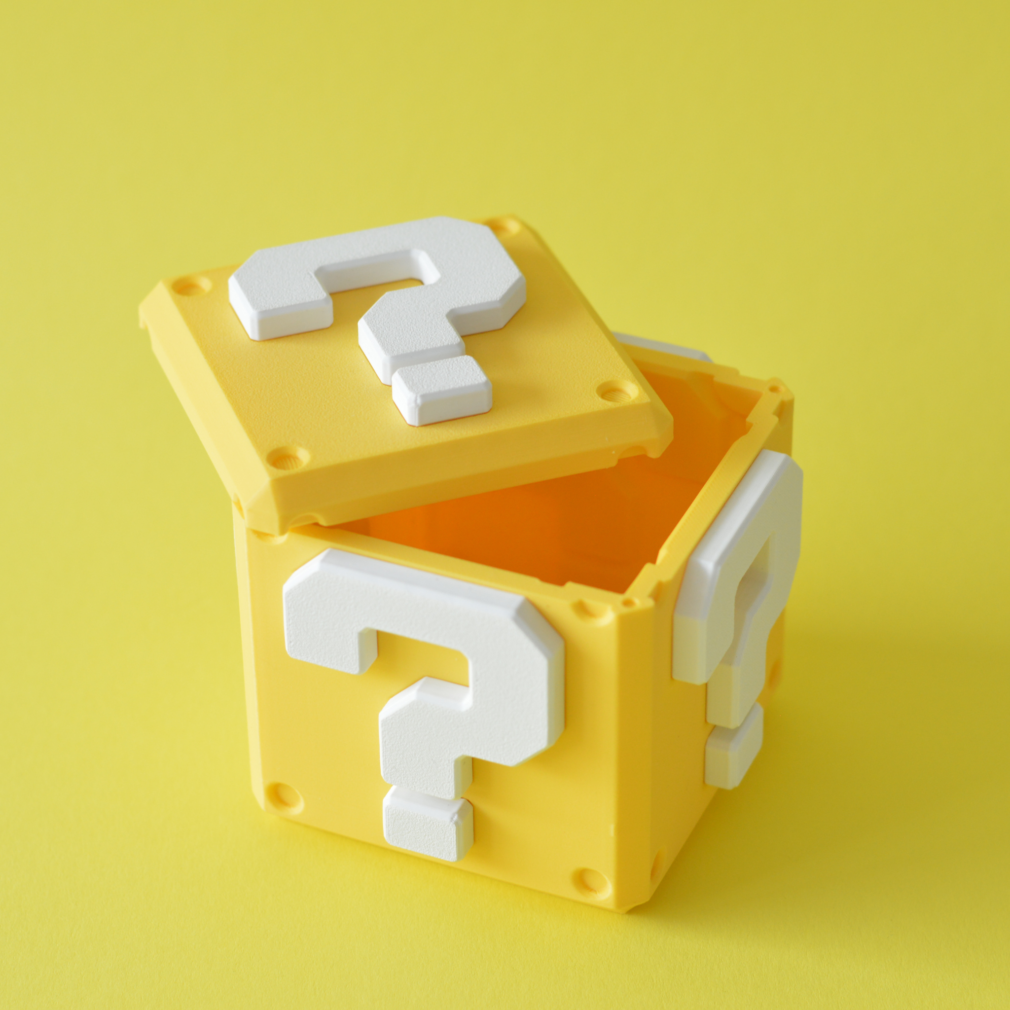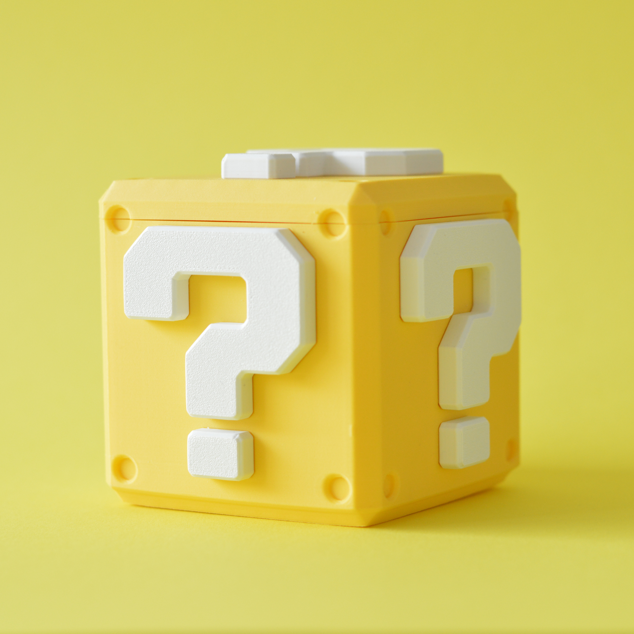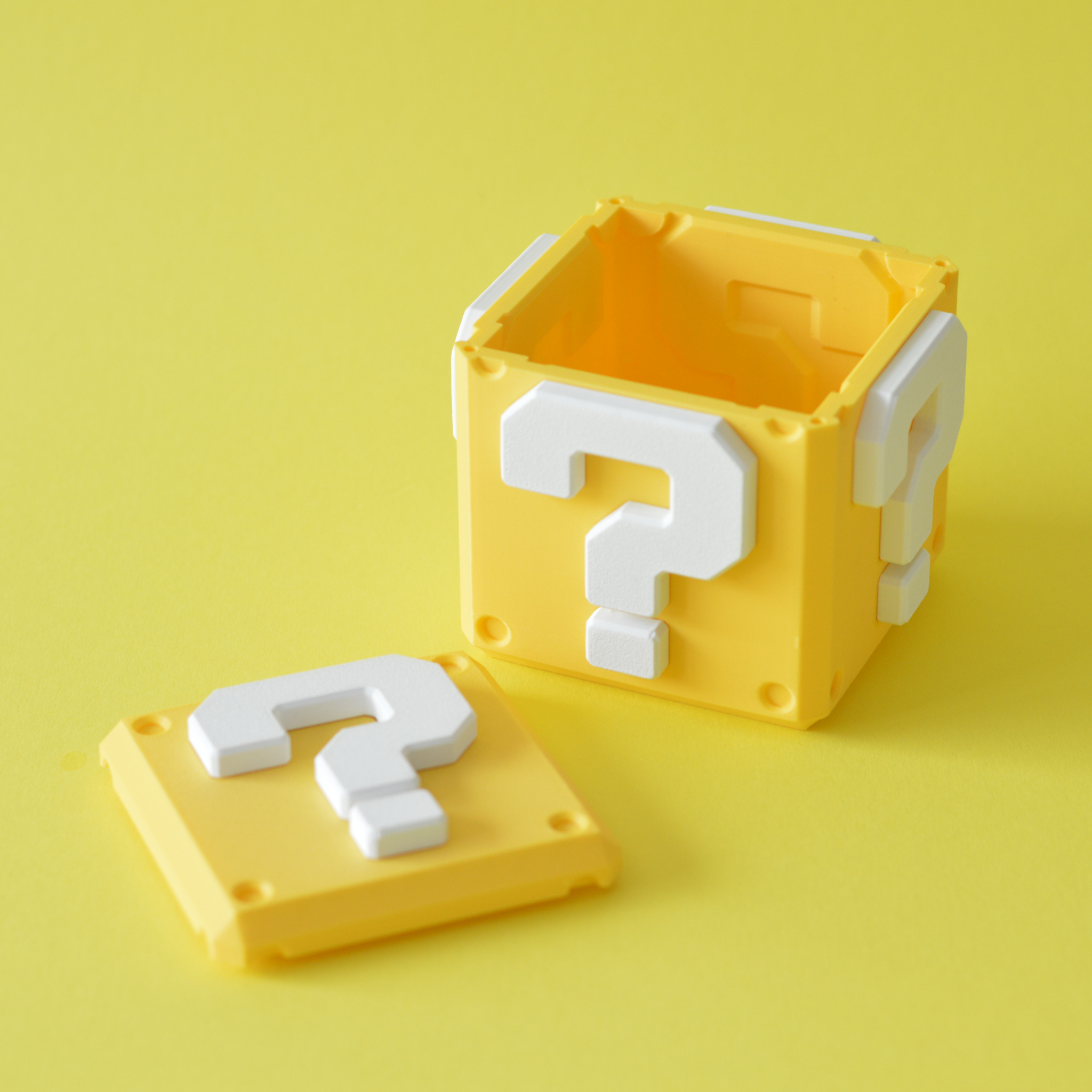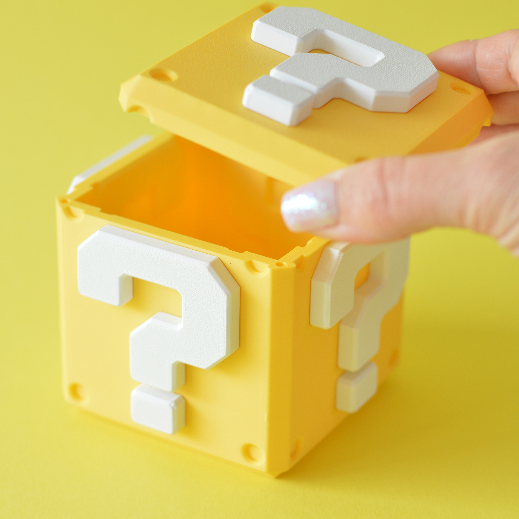 Inspired by one of the most iconic elements from the Super Mario world, this question block box is a playful and eye-catching piece designed to stand out.